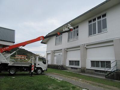 9月に襲来した台風14号の影響で破損した体育館の屋根の軒を「有限会社 誠栄」の方々が修理して下さいました。高所作業車を使用しての作業でした。運動会前に元通りにして下さりありがたかったです。日南市教育委員会の素早い対応に感謝します。