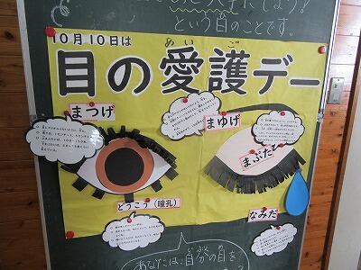 本校の保健室の掲示板には、目の愛護デーだけでなく季節等に応じた子ども達の興味が湧くような楽しい掲示がなされています。