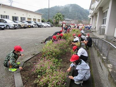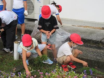 18日の朝の時間に、全校児童で栽培活動を行いました。各学年の花壇の雑草を先生方と子ども達全員で抜きました。みんなで手を汚しながら協力して取り組みました。土に触れるという機会が少ない子ども達にとっては、自然に触れるという貴重な体験だと思います。