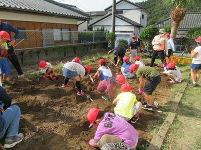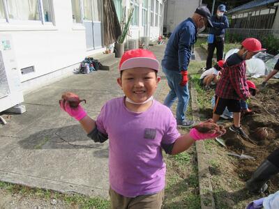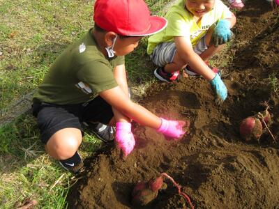 27日に1・2年生は、生活科の学習でサツマイモを収穫しました。学校園でそれぞれスコップを片手に土を掘りサツマイモを掘り当てていました。とても大きなサツマイモがたくさん見つかり、みんなそれぞれうれしそうに歓声をあげていました。