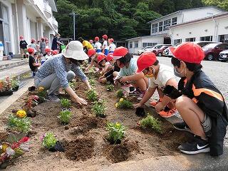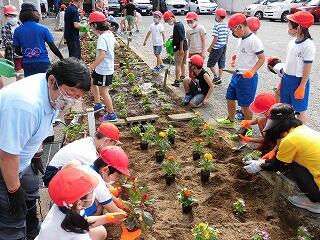 学校に来ている児童が、花壇の草抜きや、花の手入れをしていました。