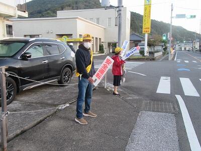 JR大堂津駅前で、細田地域づくり協議会、交通安全協会、自治会、高齢者クラブ、警察等、約30人が参加して、のぼり旗やハンドプレートを掲げ、運転者への安全意識の啓発を行いました。学校代表として、細田中と大堂津小の校長が参加しました。