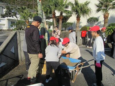 17日の5・6校時に、5・6年生は門松づくりを行いました。昨年度までは、PTA番屋塾の方々と学校の職員で実施していましたが、本年度は児童を交えての門松づくりを実施しました。当日は、大内PTA会長及び河野塾長と地域の方々を講師にお招きしました。まず、門松に使用する竹切りからでした。講師の方々の御指導の下で、みんなで力を合わせて、鋸で竹を切りました。子ども達は、まっすぐに鋸を引くのに苦労していましたが、何とか必要数分の竹を切ることができました。その後は、校門に移動して、砂入れや飾り付けを行い、立派なきれいな門松が完成しました。最後に完成した門松をバックに記念撮影を行いました。日本の伝統である門松づくりを体験して、子ども達は、とても満足そうでした。