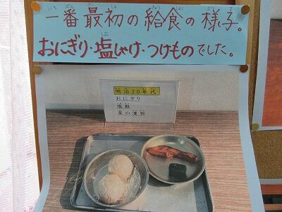 また、保健室前の掲示板には、学校給食の移り変わりについて写真が掲示してあります。一番最初の給食のメニューは、「おにぎり、塩じゃけ、つけもの」だったそうです。