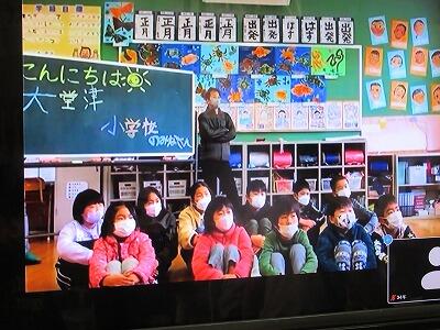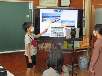 最初に1人ずつ紹介を行い、その後、それぞれの地域や学校について発表を行いました。鞍岡小の発表を聴いて、本校の児童は、鞍岡では気温が氷点下になり積雪が30センチもあること、スキー場が近くにあり雪遊びができること、給食に鹿肉やヤマメが出ること等に驚いたようでした。逆に鞍岡小の児童は、大堂津小には冬でも半袖の児童がいることや現在の気温が20度近くあること、学校にカニが住んでいること、遠足等で海水浴場に行くこと等に関心があったようでした。