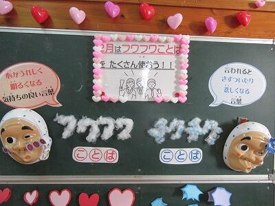 今月の保健室の掲示は「2月はフワフワことばをたくさん使おう」です。「フワフワことば」とは心がうれしく明るくなる気持ちの良い言葉のことです。それに対して、言われると心が傷ついたり悲しくなる言葉を「チクチクことば」としています。子ども達はフワフワことばを使って友達等に対する心温まるメッセージを書いて「フワフワことばの木」にたくさん貼り付けています。大堂津小の子ども達の心を幸せにする心優しい取組です。
