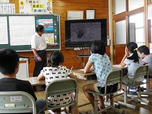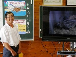 4年生の総合的な学習の時間では、「未来に残そう大堂津」というテーマで学習を進めています。その中の一コマとして「アカウミガメ」について調べています。昨日は、専門家を招き、お話と子どもたちの質問に答えていただきました。