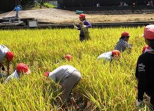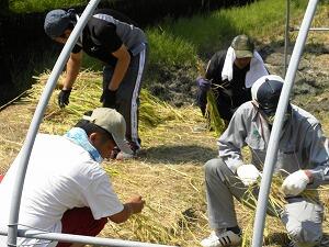 鋸鎌を使って手作業で稲刈りをしました。また、刈った稲を束ねるのは力が必要なため、番屋塾(保護者)の方々も一緒に手伝っていただきました。次の登校日(脱穀)までは、かけ干しをしておきます!