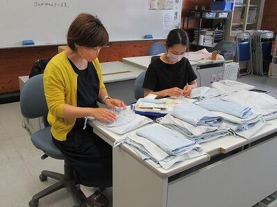 本日、PTA地区事業部の方々が給食着の補修をして下さいました。