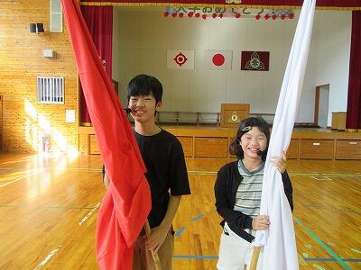 最初に各団の団長、副団長、リーダーによる自己紹介を行いました。次に各団の団長が秘密の水の入ったペットボトルを振り、赤団と白団が決定しました。最後に校長が赤団団長の川越健史郎さんと白団団長の竹井乙葉さんに団旗を授与し終了しました。