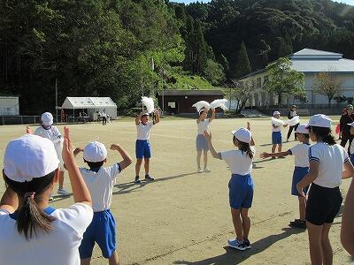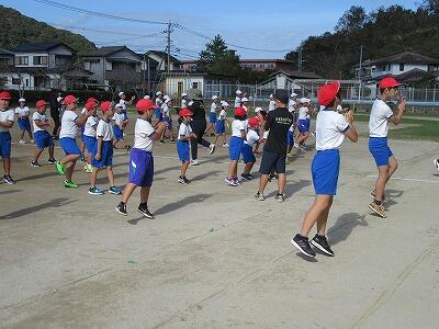 4日に第2回の全校体育を実施しました。今回は、エール交換と全校ダンスの大堂津音頭の練習を行いました。