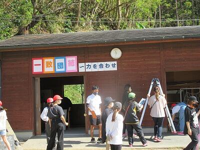 明日はいよいよ運動会です。本日の4校時に運動会の前日準備を行いました。4/・5・/6年生児童と保護者・番屋塾の方々と職員で、机・椅子を並べ、看板の掲示、入場門設置、くい打ち、万国旗張り等を行いました。また地域コーディネーターの平角さんも運動場のブラシかけやライン引きを行って下さりました。保護者の方々がたくさん参加して下さったおかげで約1時間で終了することができました。ご協力ありがとうございました。明日無事に運動会が迎えられそうです。
