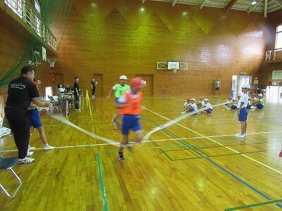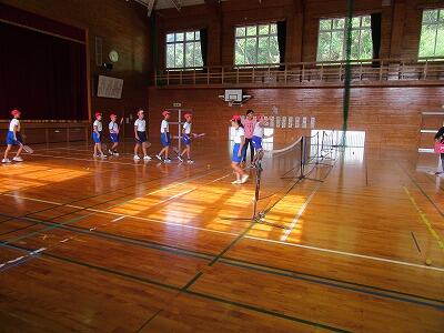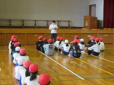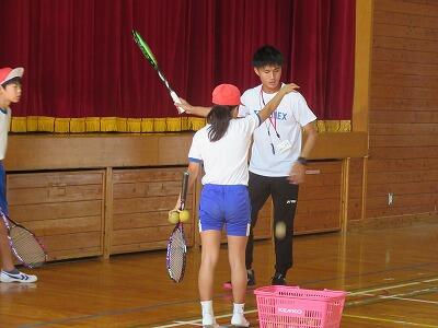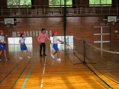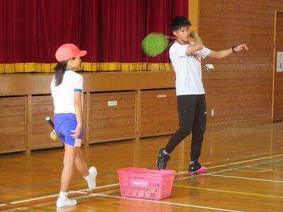 12日の3校時に、細田中の笠牟田先生が、5・6年生に体育の指導を行ってくださいました。今回は、軟式テニスの体験授業でした。体育館の中央にネットを設置し、それぞれラケットを持って、ボールを打ちました。初めて体験する子も多く、なかなかラケットにボールが当たらず苦労している場面もありましたが、笠牟田先生の丁寧なご指導で、みんなボールが打てるようになりました。笠牟田先生からも、「上手です。」、「元気で礼儀正しいです。」等のたくさんのお褒めの言葉をいただきました。来週の体育指導も楽しみです。