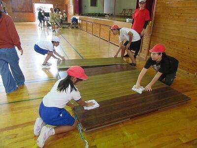 29日の朝の時間に、4・5・6年生で運動会の後片付けを行いました。運動会当日は、雨のために片付けることができなかったパイプ椅子や長机等の片付けを中心に行いました。5・6年生が、運動場から体育館に運び、それを4年生が雑巾で拭き上げました。短時間の作業でしたが、きれいに片付けることができました。