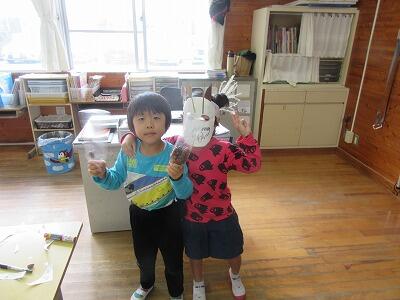 また、生活科の学習で、1年生は、秋の植物を材料におもちゃづくりに励んでいました。お面や楽器等の手作りのおもちゃで楽しそうに遊んでいました。