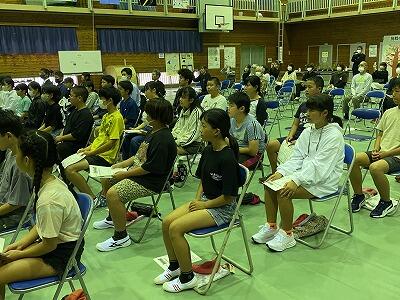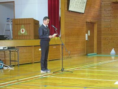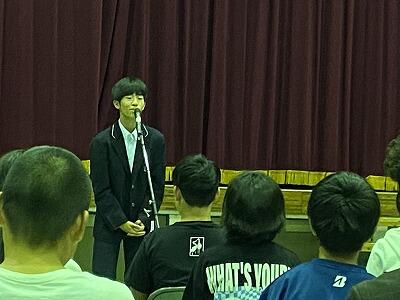 最初に校長が「あきらめない」ことと「感謝すること」の大切さについて話をしました。パリオリンピック金メダリストの堀米雄斗選手とスターバックスコーヒーのCEOのハワード・シュルツ氏の言葉を例に挙げ、先日の運動会が無事に実施できたのは、大堂津全体のあきらめない心と周りの方々の協力のおかげだと話しました。