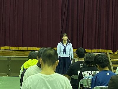 発表会は、全て、中学生が運営していました。最初に生徒会長の話があり、次に英語暗唱発表でした。長い英文をすらすらと3年生の竹本花音さんが発表しました。子ども達は、感動していました。