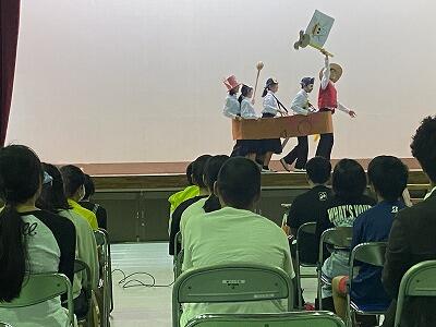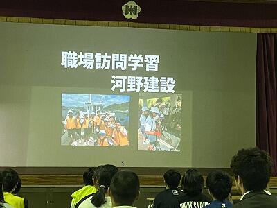 最後は学年ごとの職場体験学習の発表でした。工夫されたプレゼンテーション、ユーモアを取り入れた寸劇、興味をそそるクイズ等、さすが中学生と思わせる素晴らしい発表でした。