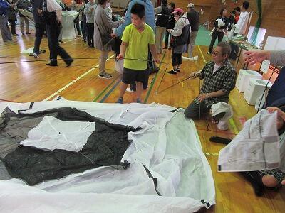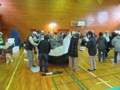第2部では、最初に高橋透市長が挨拶をされ、次に市の防災専門官の永井氏と市の災害アドバイザーの小早川氏が講話をされました。その後、体育館内と通路で、簡易テント及び段ボールベットの組み立てと発電機の取扱い等を実技体験しました。講話は、南海トラフクラスの地震が起こった時に、実際にどのあたりまで津波が来るのか等とても具体的な内容でした。また、実技体験は、グループごとに分かれての体験で、本番を想定すると、とても貴重な体験だったと思います。