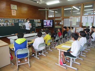 19日の2校時に、3・4年生は、日南市の株式会社「ことろど」の内田真央様を講師にお招きして、日南市の魅力等についての出前授業を実施しました。内田先生は、福岡県のご出身で、日南市の油津に訪れた際に、その魅力にt感激されて、日南市で働くことを決意されたということです。日南の人々の優しさ、魚、鶏等の食べ物の美味しさ等、日南市の素晴らしさをたくさん語ってくださいました。また、仕事としては、西武ライオンズのキャンプ地である南郷での駅や球場の装飾、日南市の魅力的な宿泊施設の運営、日南市での働く場所等の紹介等に携わっていらっしゃるということでした。