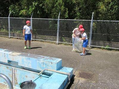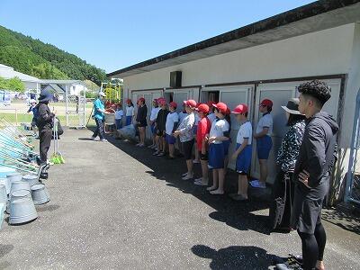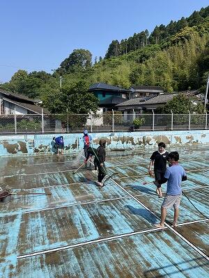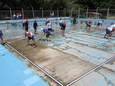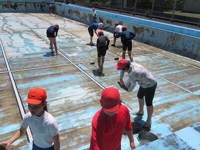 25日の土曜日に番屋塾と職員でプール清掃を行いました。番屋塾の方々は、毎年、水泳学習前にプール清掃を行ってくださいます。当日は晴天の下で、午前中に清掃を行ってくださいました。子どもと職員でもプール清掃を行うのですが、とても手が回りません。お休みにもかかわらずに参加してくださった方々に心より感謝申し上げます。