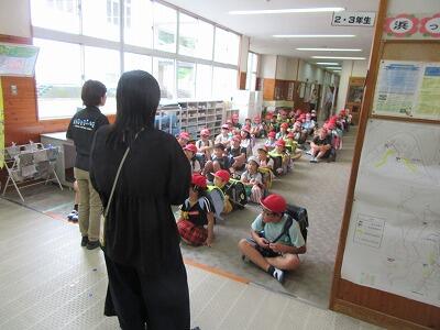 放送の合図とともに子ども達は、手早く下校準備を行い、速やかに児童玄関前のワークスペースに学年ごとに整列しました。そこで、注意事項、下校の仕方等を聴いた後、引き渡し開始となりました。番屋塾の方々、地域コーディネーターの平角様が車の誘導等を行ってくださり、速やかに安全に下校を終了することができました。これから、梅雨に入り、台風等の襲来も予想されます。今回の避難訓練をしっかりと踏まえて備えたいと思います。保護者、番屋塾、地域コーディネーターの皆様、避難訓練へのご協力ありがとうございました。