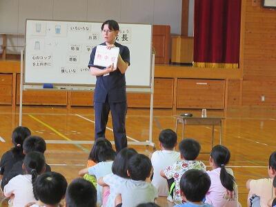 4校時は、同じく体育館で家庭教育学級を実施しました。保護者と5・6年生が参加しました。海上保安庁の方々を講師にお招きして海上安全教室を実施しました。ライフジャケットの実物に一瞬で空気が注入される様子等を見て、子ども達は驚いた様子でした。