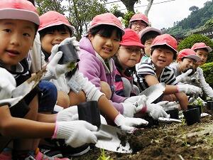 やわらかな気持ちのよい風を感じる朝に、「グリーンタイム」を行いました。今日は、日々草やポーチュラカといった花の苗を学級園に植えました!