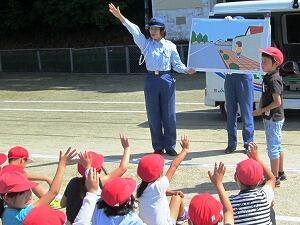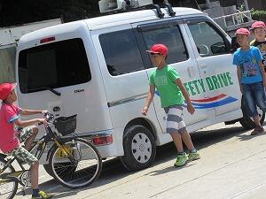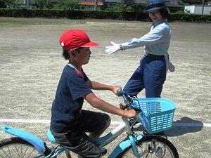 気持ちのよい青空の下、低・中・高学年ごとに、交通教室が行われました。交通安全協会の方々から、道路での歩行の仕方や自転車の乗り方を学びました。