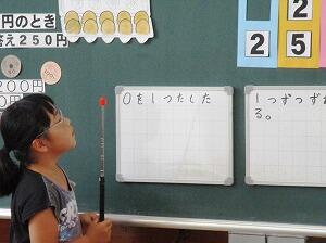 算数科の授業風景です。1年生は、「何番目」というように順序を示す数の意味を考えています。2年生は、長さの単位を考えています。6年生は、「x」や「y」の文字を使って数量の関係を式に表すことを考えています。