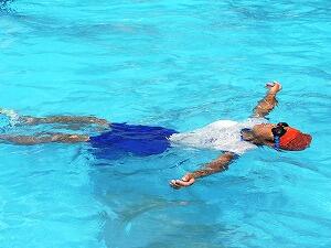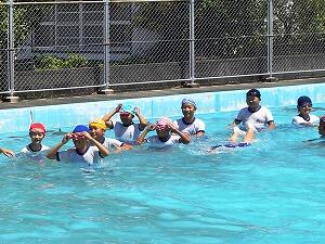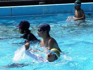 快晴の中、水の事故から身を守る「背浮き」の体験を、全学年で実施しました。