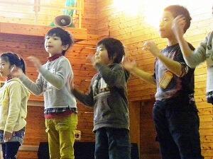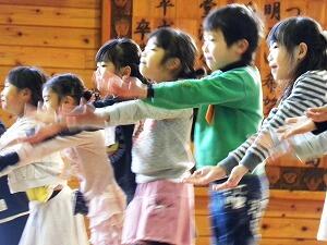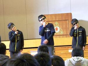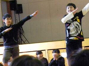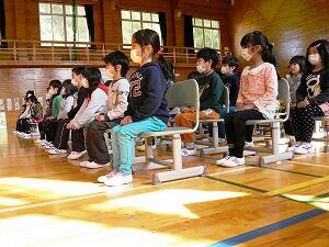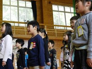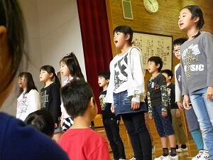 4年生が、1年生に校歌の歌い方を伝授しています。高音では、体育館中によく通る声が、響き渡りました。