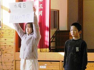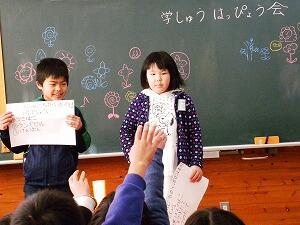 学校の桜が、ちらほら咲き始めました。そんな中、5年生は、卒業式の歌の練習がはじまりました。2年生は、学習発表会に向けて、何をするのかを話し合っていました。