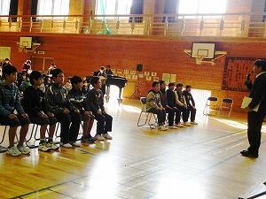 卒業式の練習がはじまりました。1回目の今日は、式に臨む心得や態度についての話と礼や起立などの練習をしました。
