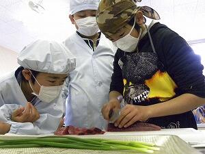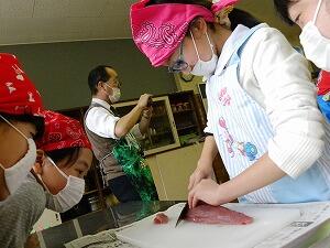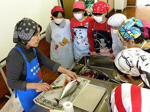 5年生の「総合的な学習の時間」では、大堂津の食文化について調べています。今日は、日南市漁協女性部の方をお招きし、かつお飯を実際につくりました。