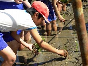 快晴の中、田植え体験を行いました。収穫したもち米は、12月に「もちつき会」で使います。本日は、保護者や地域の方々も協力していただきました。ありがとうございました。