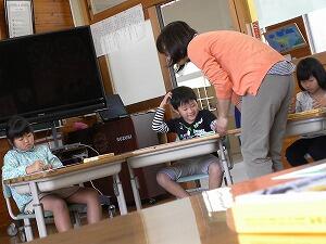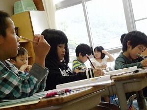 1年生は、算数のテストに取り組んでいます。4年生は、県の形を見て、何県かを復習しています。6年生は、みんなで合奏の練習に励んでいます。