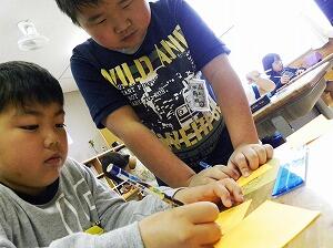 4年生の図画工作科の時間です。「おもしろアイディアボックス」とう題材で、段ボールの特長を生かしながら、便利に楽しく使える収納箱を製作しています。