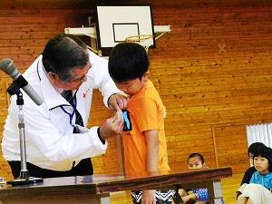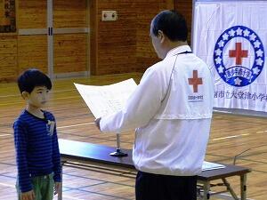 本日は、宮崎県青少年赤十字賛助奉仕団の落合様にお越しいただき、本校の赤十字登録式を行いました。新1年生の代表には、赤十字バッジの贈呈も行いました。また、「赤十字・いのちと献血俳句コンテスト」において、入賞した児童への表彰が、そして、大堂津小学校が団体賞を受賞しました!