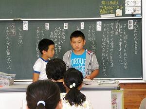 1年生が生活科で野菜の植え付けをしています。3年生は、社会科で企業を見学した後にどうやってまとめていくのかをグループで話し合っています。4年生は、国語の音読を真剣にしています。