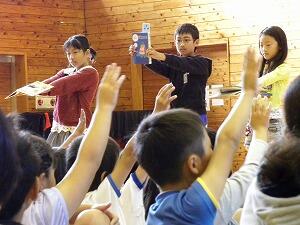10月の児童集会です。2年生の音読や歌の発表がありました。体を使った元気いっぱいの表現でした。最後に、図書委員会からの発表がありました。