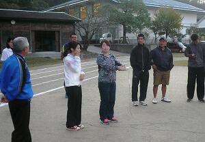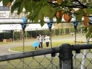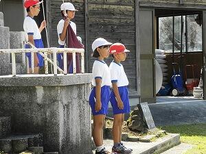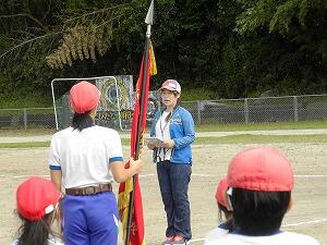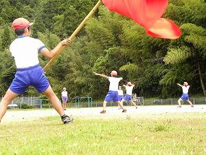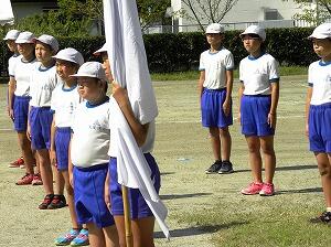 昼休みには、赤団・白団のリーダー達が、応援の練習を毎日しています。今日は、運動場で旗係の打合せと練習が行われていました。