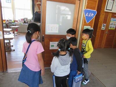 9日の2校時に、1・2年生は生活科の学習で学校探検を行いました。グループに分かれて、2年生が1年生に学校内を案内し、教室についての説明を行うという内容でした。2年生は、お兄さんお姉さんらしく優しく学校内を案内していました。