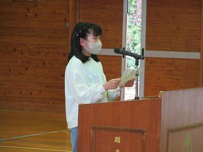 その後、始業式を行いました。最初に6年生の宇都あやなさんが作文を発表しました。6年生として全校を優しくリードしたいという最高学年の思いが伝わる発表でした。次に校長が、「大きな心」「思いやりの心」「努力する心」「美しい心」「強い心」の五つの心をもって1年間過ごしてほしいという話をしました。最後に全員で校歌を斉唱しました。