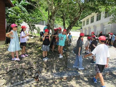 7月に入り、晴れの日が多くなり気温も上昇してきました。こうなってくると心配なのが熱中症です。本校ではそれに伴い様々な対応を行っています。先週の全校朝会で養護教諭の池田先生から熱中症は命に関わる恐れがあることやその予防法について話をしていただきました。また、池田先生は、毎日、熱中症の危険度を測る測定器で危険度を測定しています。その結果を委員会のお友達が、毎日、お昼の放送で流し、安全を呼びかけます。昼休みの外遊びでは、CDで2種類の音楽を流し、ひなたで遊んでも良い時間と日陰で休んで給水する時間を知らせています。