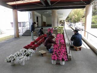 明日、卒業式の式場を飾る鉢花が体育館周辺に並んでいます。とてもきれいに咲いています。