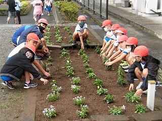 朝の活動の時間にグリーンタイムを行い、学級園に冬春用の花の苗を植えました。