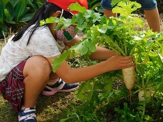 先日、さつまいもの収穫を行いましたが、今回も、大きく育った大根を引き抜くと、子どもたちは大はしゃぎでした。