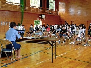 56年生は、日南警察署の方を招いて非行防止教室を行いました。