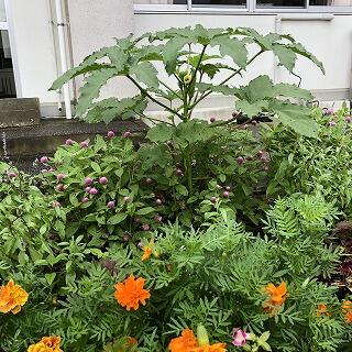長雨が続いていますが、校内の植物は元気に生長しています、花壇に、なぜかオクラが生えていて、ついに花が咲きオクラがなっています。